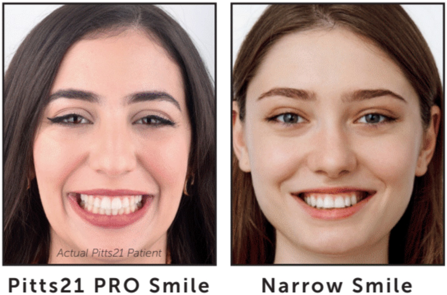 Różnice między systemem Pitts21 PRO a tradycyjnym leczeniem można zobaczyć, porównując zdjęcia pacjentów, gdzie często przy wąskim uśmiechu zauważysz ciemne korytarze w kącikach ust, powstałe po usunięciu zębów. Uśmiech Pitts21 PRO charakteryzuje się szerszym, piękniejszym uśmiechem, ponieważ zdrowe zęby nie zostały usunięte. Pitts21 PRO pozwala Twojemu ortodoncie tworzyć uśmiechy tak wyjątkowe, jak każda osoba.